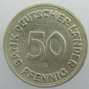 50 pfennig bank deutscher länder 1950 g. Nachdem bis ende 1949 über 150 millionen münzen mit der aufschrift bank deutscher länder geprägt wurden, ging 1950 die münzhoheit auf das bundesfinanzministerium über und die inschrift wurde geändert. Kunden, die diesen artikel kauften, haben auch folgende artikel bestellt: Eigentlich hätte diese münze mit der schrift bundesrepublik deutschland geprägt werden müssen! Nach beendigung des zweiten weltkriegs wurde deutschland unter verlust der ostgebiete in vier besatzungszonen eingeteilt.
